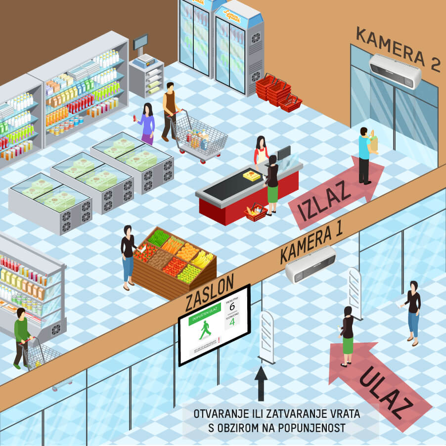 Uz pomoć people counting kamere postavljaju se parametri kada je ulaz dopušten ili zabranjen. Ako je kapacitet prostora popunjen ulaz će biti onemogućen.